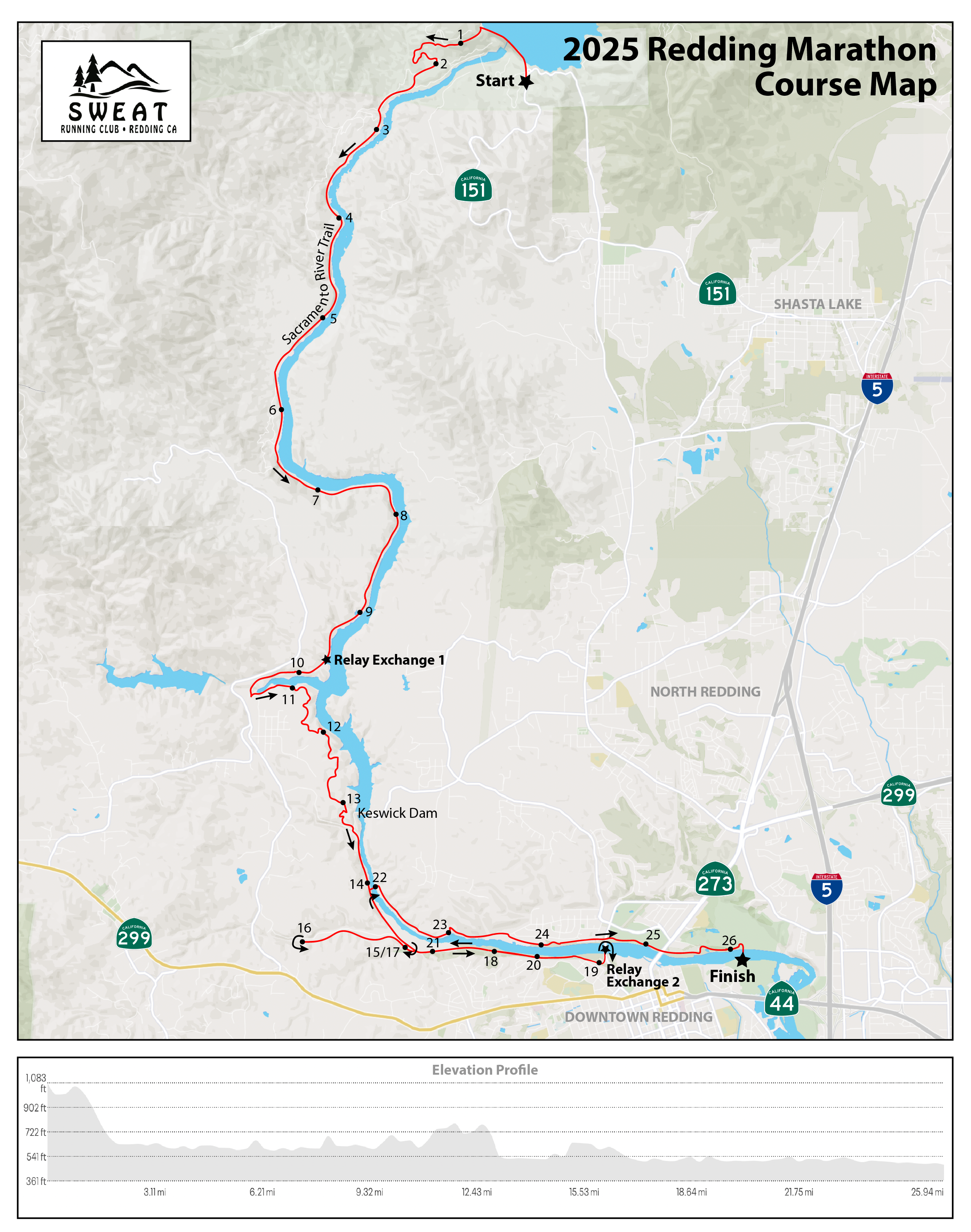 The start line is at the famous Shasta Dam located north of Redding in the town of Shasta Lake City. You will run across the dam and descend down to the paved trail that parallels the Sacramento River. Stunning views await you as you will run the 1st 9.7 miles to the Keswick transistion ( leg 1-2 of the relay)